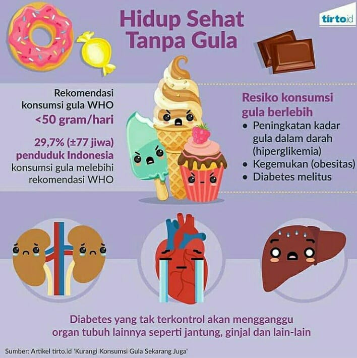 Kurangi konsumsi gula tambahan dan minuman manis. Salah satu anjuran: gula tambahan maksimal sekitar 50 gram/hari atau setara 4 sendok makan.