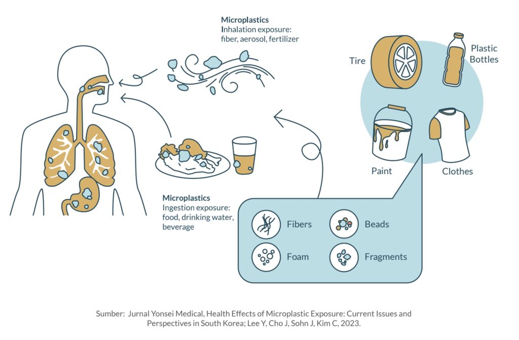 Partikel mikroplastik dapat masuk ke dalam tubuh manusia melalui udara (terhirup) atau makanan/air (tertelan). BRIN menyebut hujan yang mengandung mikroplastik dapat “mengontaminasi air permukaan dan masuk ke rantai makanan”.